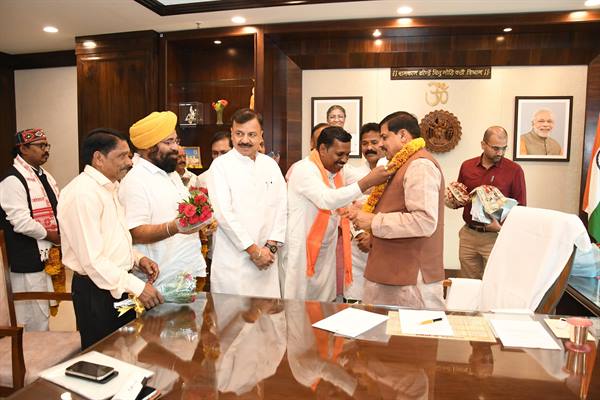 भोपाल : मुख्यमंत्री डॉ. मोहन यादव से विधायक पिपरिया ठाकुरदास नागवंशी के नेतृत्व में पचमढ़ीवासियों ने मंत्रालय में भेंट की। उन्होंने पचमढ़ी नगर की नजूल भूमि को अभयारण्य की सीमा से पृथक करने के निर्णय के लिए मुख्यमंत्री डॉ. यादव का आभार माना। उन्होंने मुख्यमंत्री डॉ. यादव पुष्प-गुच्छ और पुष्पहार से अभिवादन किया। इस अवसर पर पूर्व साडा अध्यक्ष कमल धूत और नवनीत नागपाल सहित अन्य जनप्रतिनिधि साथ थे। उल्लेखनीय है कि मुख्यमंत्री डॉ. यादव की अध्यक्षता में 6 मई को हुई मंत्रि-परिषद की बैठक में इस आशय का निर्णय लिया गया था।
