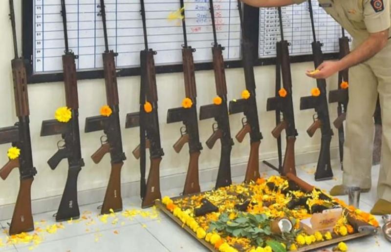 शस्त्र पूजन के लिए, सुबह स्नान ध्यान आदि करके शस्त्रों की गंगाजल से सफाई कर लें और पूजा मुहूर्त में  साफ वस्त्र बिछाकर सभी शस्त्रों को उसपर रख लें। उनके ऊपर दशहरा पूजा सामिग्री अक्षत, पुष्प, रोली, अक्षत, चंदन इत्यादि छिड़क कर धूप दीप से विधि विधान से पूजन करें।